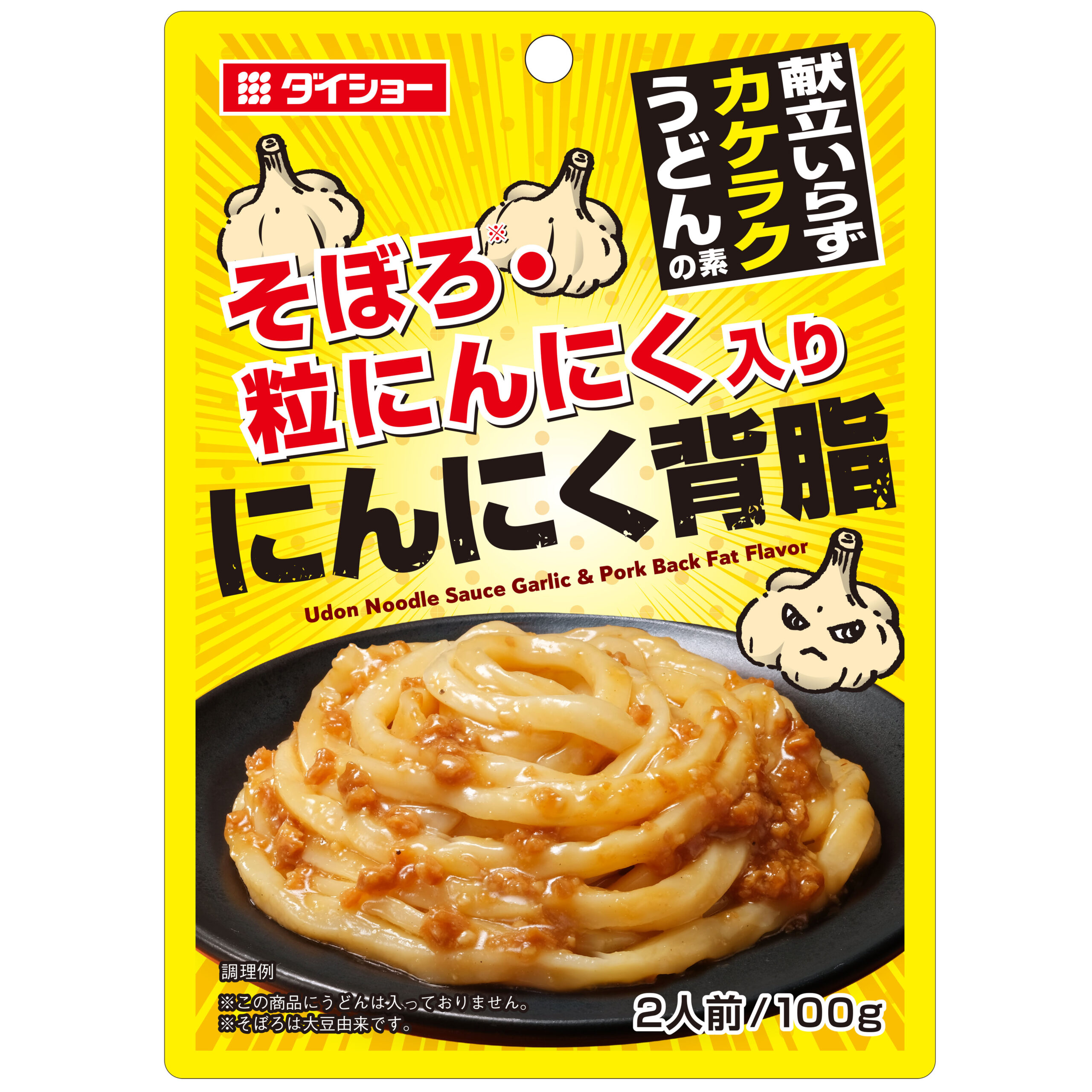 とんこつの旨みに背脂のコクとにんにくのパンチを効かせました。そぼろ・粒にんにく入りで、かけるだけで楽しめるうどんの素です。