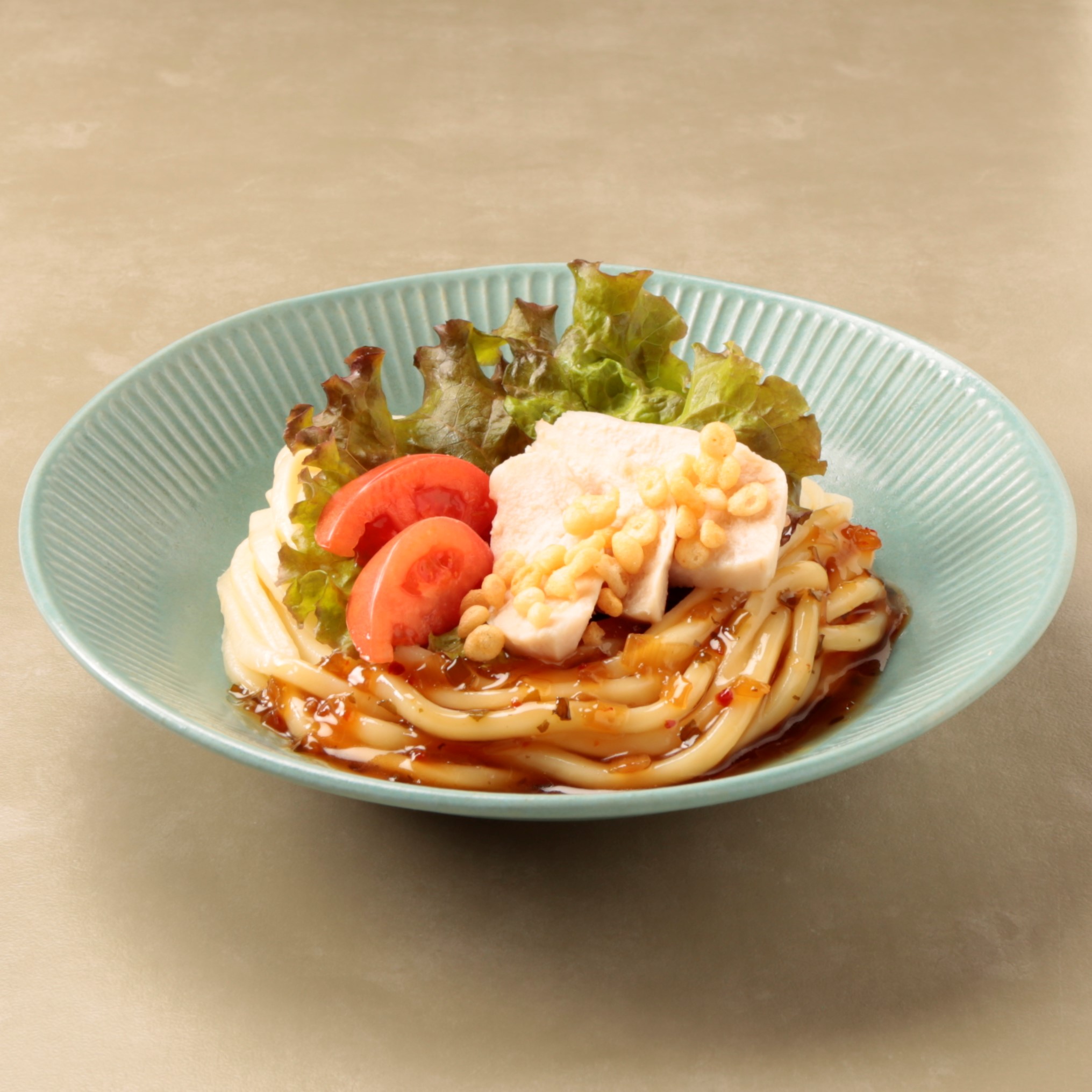 ゆでて冷水でしめたうどん、サラダチキンを1人前ずつ皿に盛ります。本品をかけ、お好みで天かすをかけたら出来上がりです。全体にからむように混ぜてからお召し上がりください。